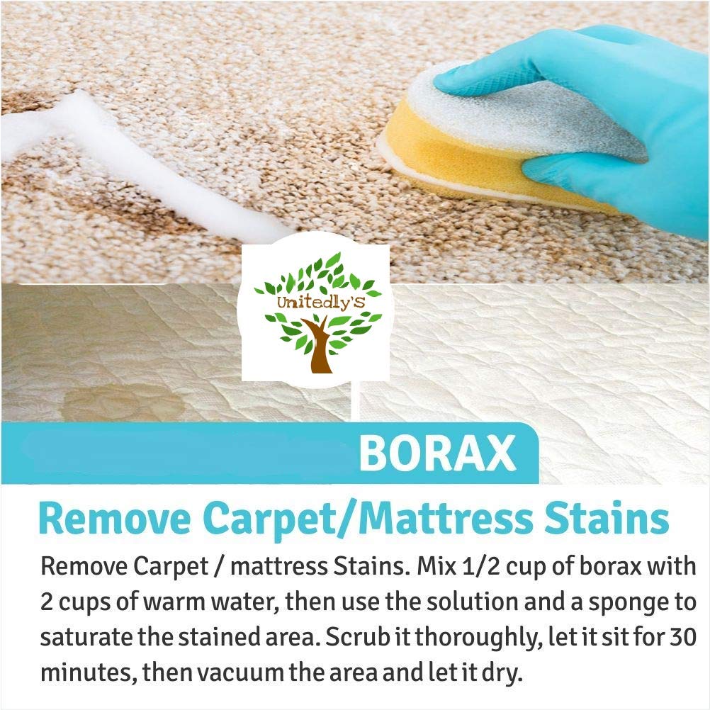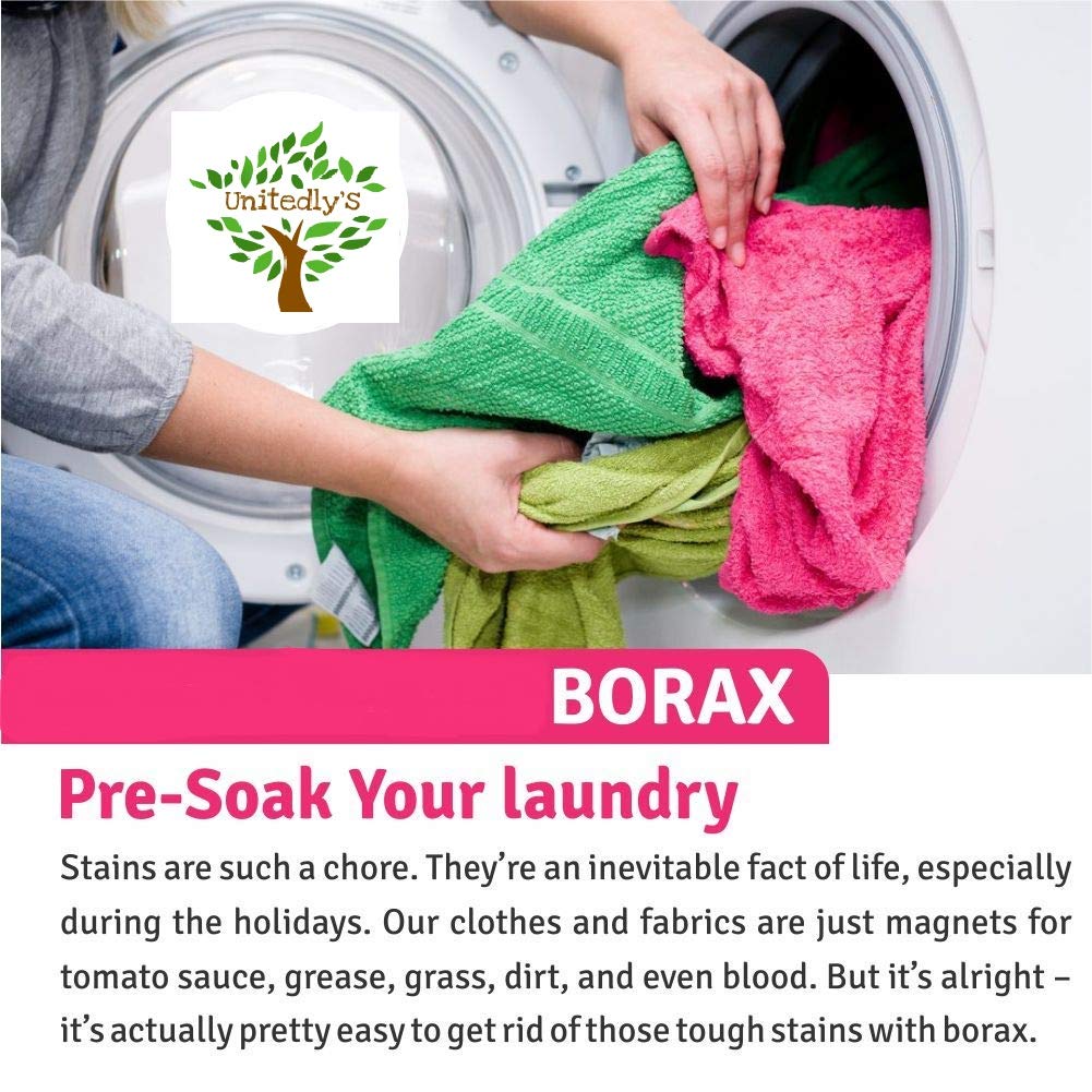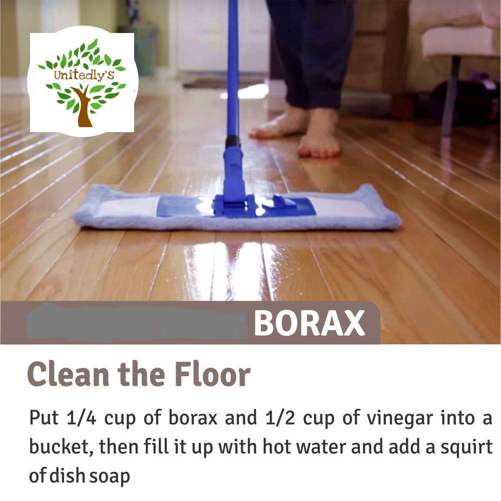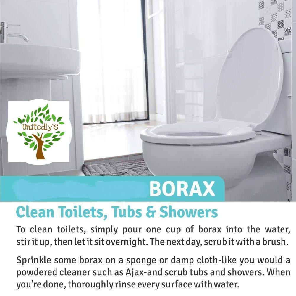 Unitedly’s Borax Power have versatile usage: Clean Tubs and Showers. Sprinkle some borax on a sponge or damp cloth-like you would a powdered cleaner such as Ajax-and scrub tubs and showers. When you're done, thoroughly rinse every surface with water. Clean Toilets. To clean toilets, simply pour one cup of borax into the water, stir it up, then let it sit overnight. The next day, scrub it with a brush. Unclog Drains. Use a funnel to pour 1/2 cup of borax down the drain, then slowly add 2 cups of boiling water. Let it sit for at least 10 minutes, then flush it out with hot water. Repeat as necessary. Clean the Fridge. That same all-purpose cleaner works on the outside of the fridge. But for food spills on the inside, all you need is one tablespoon of borax per quart of warm water. Wash the Dishes. Mix 1 tablespoon of borax with 1 tablespoon of finely grated soap, then add 2 cups of boiling water and whisk until blended. Let it sit until it cools, and then you'll have homemade dish soap. Clean the Floor. Put 1/4 cup of borax and 1/2 cup of vinegar into a bucket, then fill it up with hot water and add a squirt of dish soap. Remove Carpet / mattress Stains. Mix 1/2 cup of borax with 2 cups of warm water, then use the solution and a sponge to saturate the stained area. Scrub it thoroughly, let it sit for 30 minutes, then vacuum the area and let it dry. Borax may be used for numerous applications, including household uses such as cleaning laundry, personal care and as a natural preservative. It has been also used for home remedies, healthcare and boron supplementation. Borax is an effective natural cleaner and a safer alternative to many conventional cleaners and it can also be used as pesticide for the healthy growth of plants.